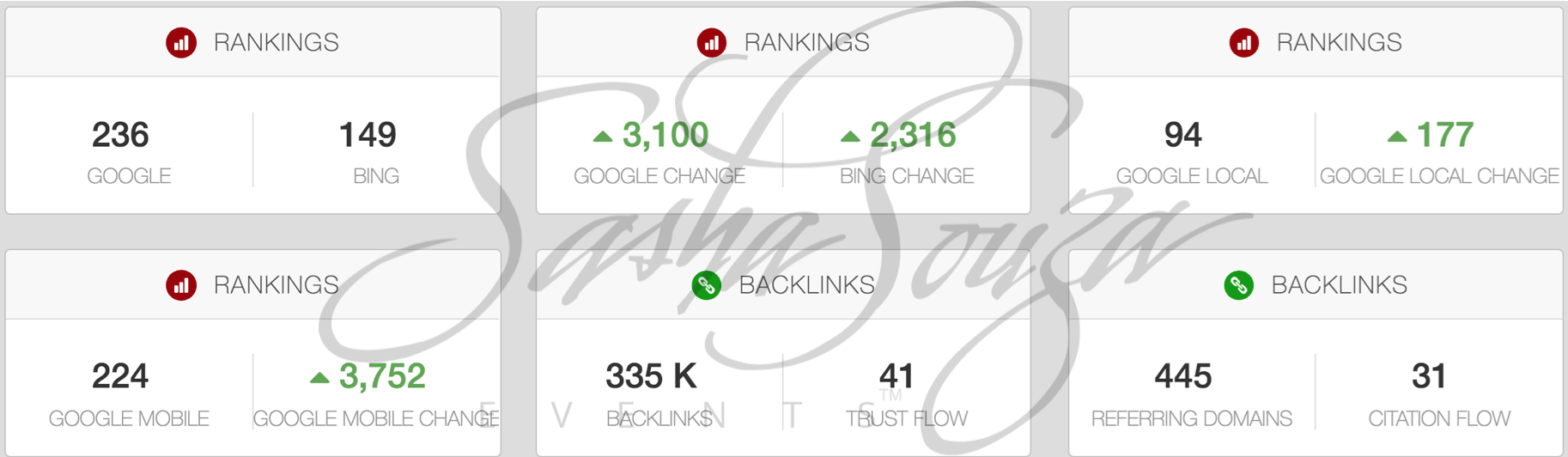 All of these rankings, my set competitors, and backlinks all lead to new inquiries looking at my website.  From there, I have to give them the goods to stay at the site and request information.  That's the next challenge.  Wedding planner, event designer, event creative SEO...just another service I offer our All Access Consultancy clients.